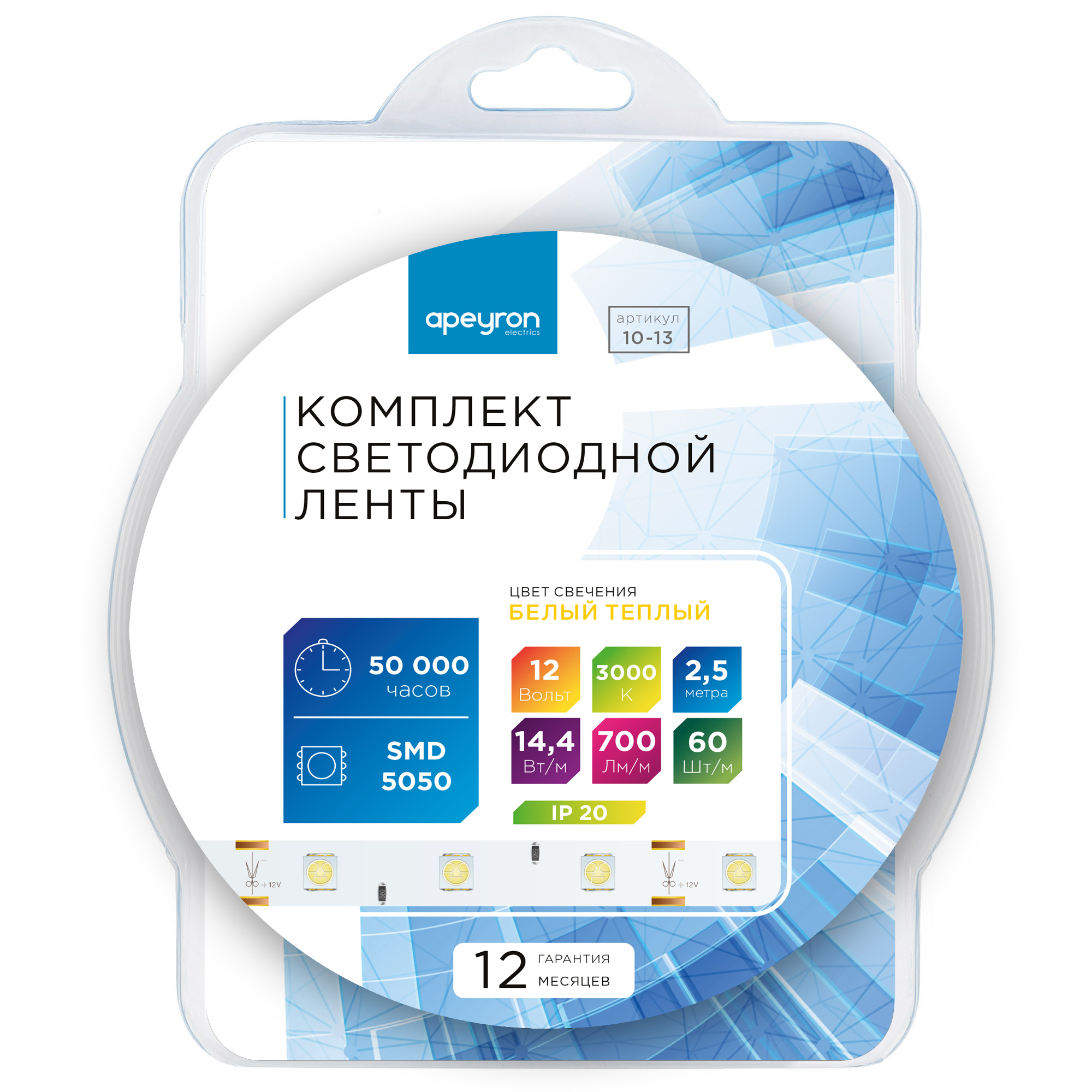 Комплект светодиодной ленты Apeyron 12В 14.4Вт/м smd 5050 60 д/м IP20 2,5м 3000K (блок, коннектор) 10-13 — купить в Bronko‑Decor